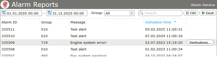 To show the alarms triggered during a certain time, set the time frame with the two date/time input fields on the top left corner. Selecting a group from the Group drop-down menu, only alarms of the selected group will be shown. With the search field, alarms can be filtered by any available metadata. Clicking the buttons labeled CSV or Excel will export the current report listing in the respective file format.
