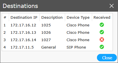 Clicking on the button labeled Destinations… will show all the destinations to which the alarm was sent; the symbol in the column Received indicates whether the destination actually received the alarm message.