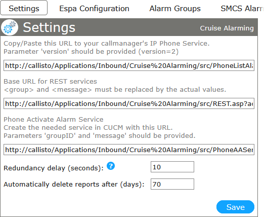 The first URL is used to set Cruise Alarming as a phone service on the call manager. This service provides the possibility to list the alarm history directly on phones which are subscribed to the service. Paste this URL to the call manager’s phone service definition.